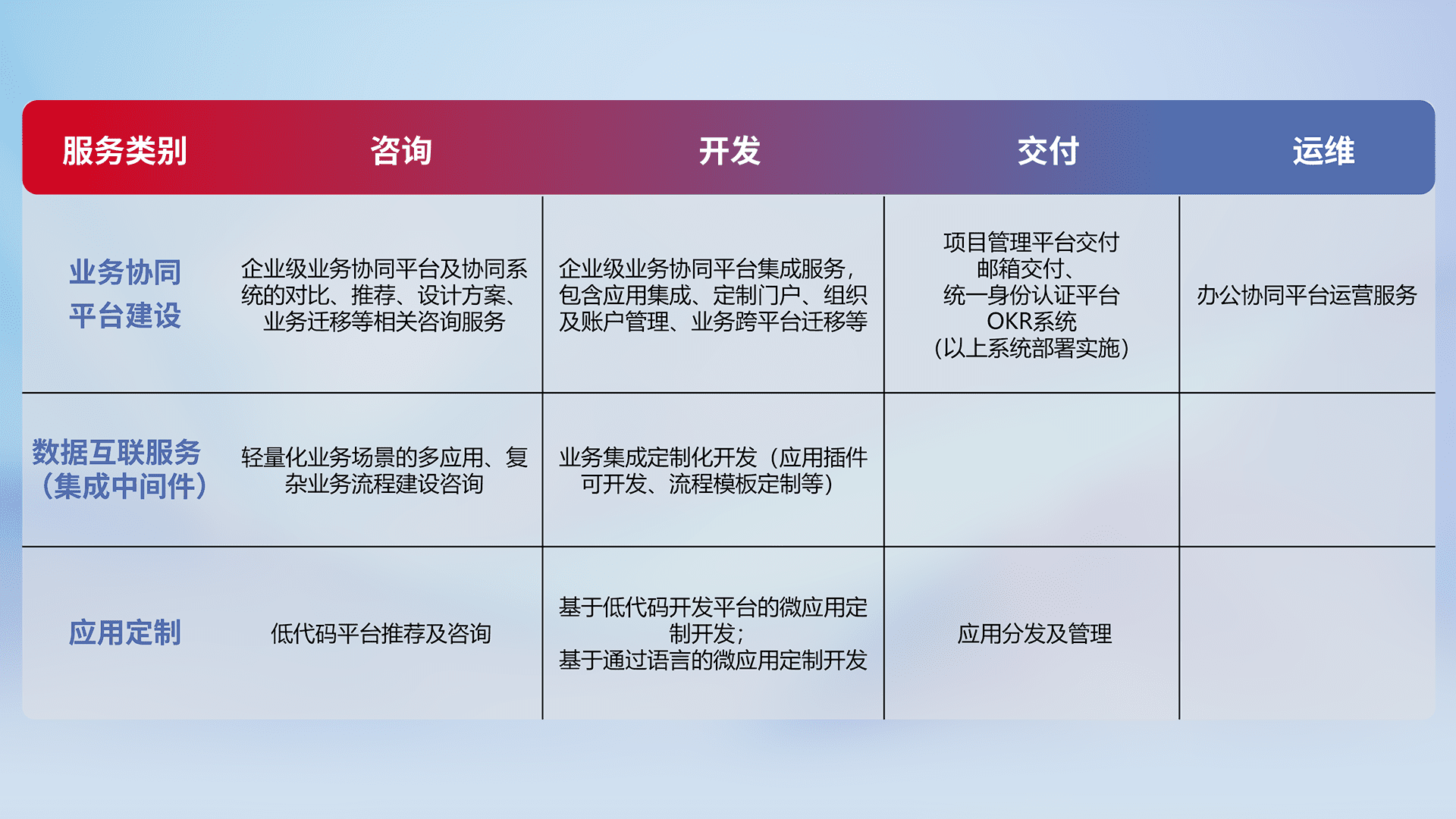 针对钉钉、、、企微、、、IDaas等平台级产品提供产品的规划、、方案、、、、交付、、、、定制化开发等服务,,,实现如统一协同办公、、智能客户服务、、、混合会议管理、、、、智能数据查询、、等业务场景,,,实现数字化转型。。。。